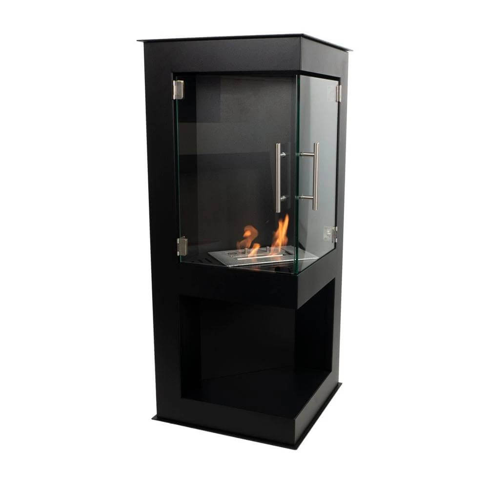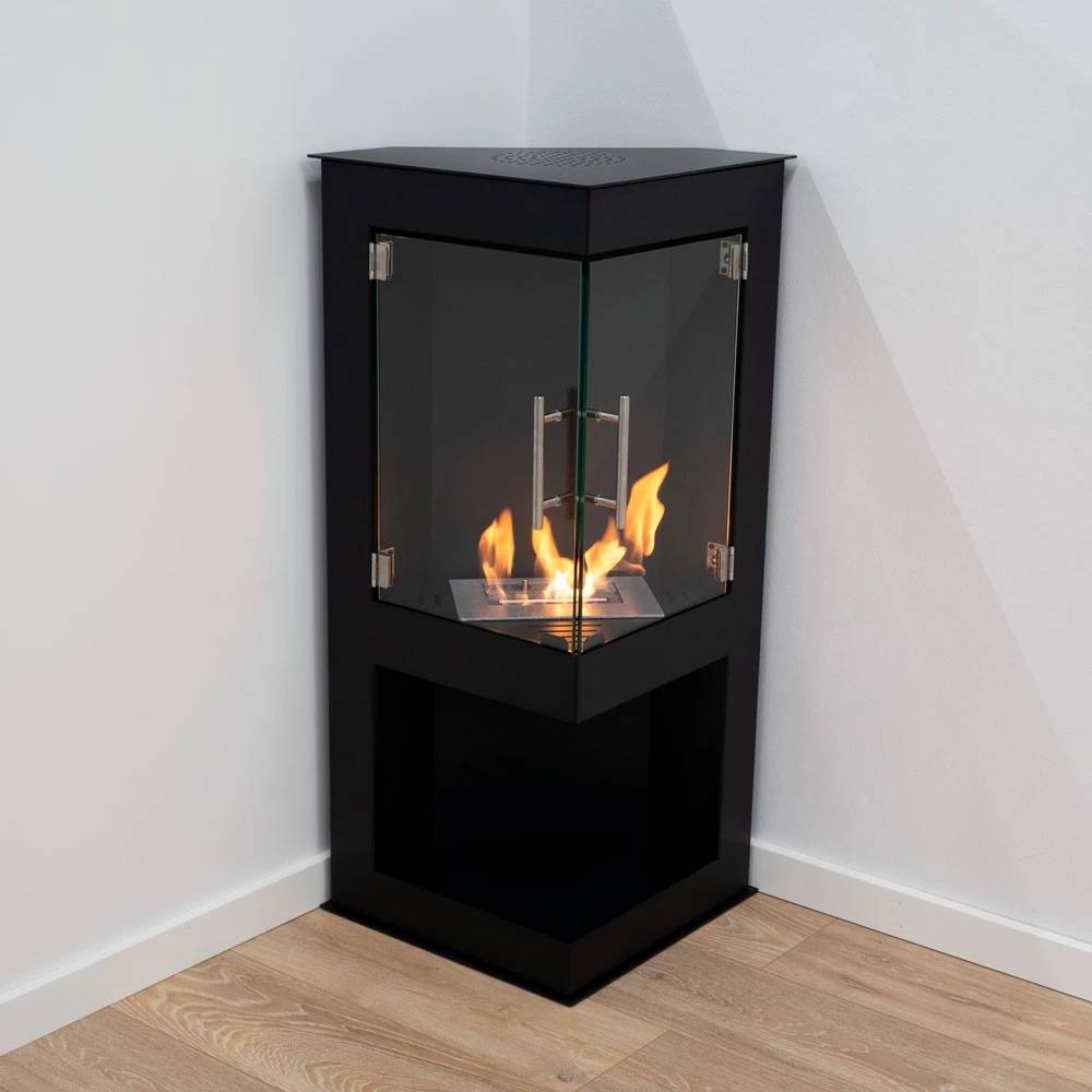 Etanolkamin Alaska är en fristående etanoldriven eldstad, särskilt anpassad för hörnplacering. Den eleganta designen låter dig njuta av lågorna från två sidor genom dess glasdörrar.