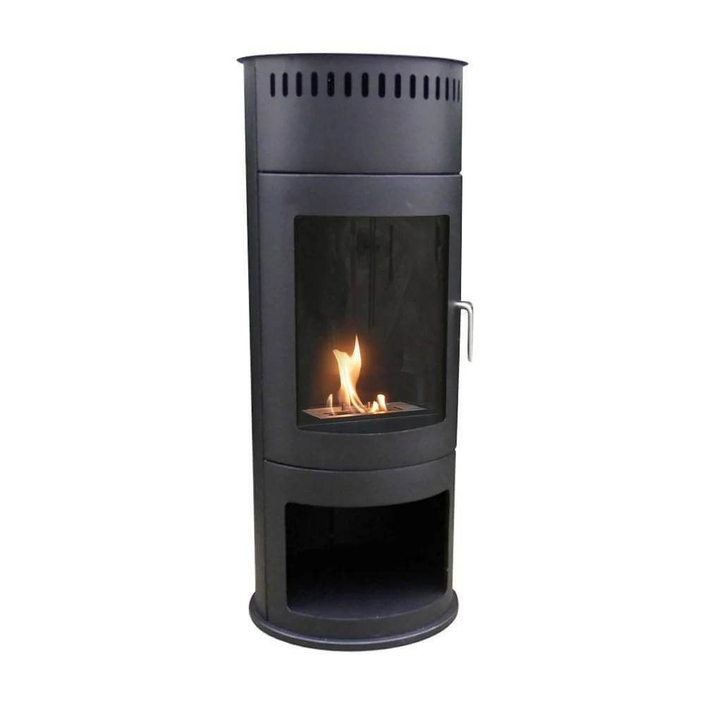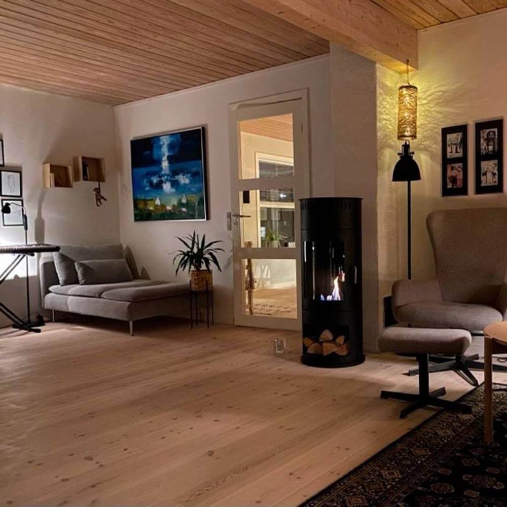 Den stilrena svarta cylinderformen tillför en sofistikerad touch till alla inredningsstilar, medan den mörka ytan framhäver eldens naturliga sken och färgspel, vilket ger en varm och inbjudande känsla. Den fristående kaminen är designad för att placeras direkt på golvet, vilket gör den flexibel att använda i olika rum – från vardagsrum till uterum.