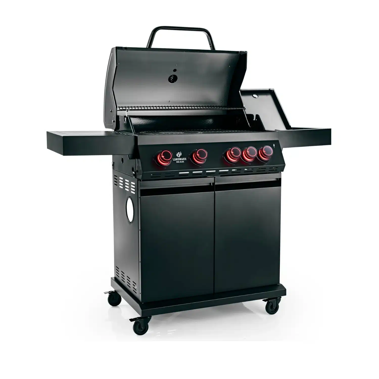 Landmann Gasolgrill Cool Black Classic 4.1 har fyra justerbara brännare på 3,65 kW vardera i rostfritt stål där du får en jämn värmefördelning och kontroll över hela grillytan. PTS-systemet tillsammans med det robusta gjutjärnsgallret säkerställer en jämn tillagning varje gång. Cool Black Classic 4.1 är utrustad med dubbla skåpsluckor som ger gott om plats för förvaring av gasolflaska och grilltillbehör. På sidan finns en praktisk kokplatta för att värma såser, koka potatis eller förbereda tillbehör direkt vid grillen.