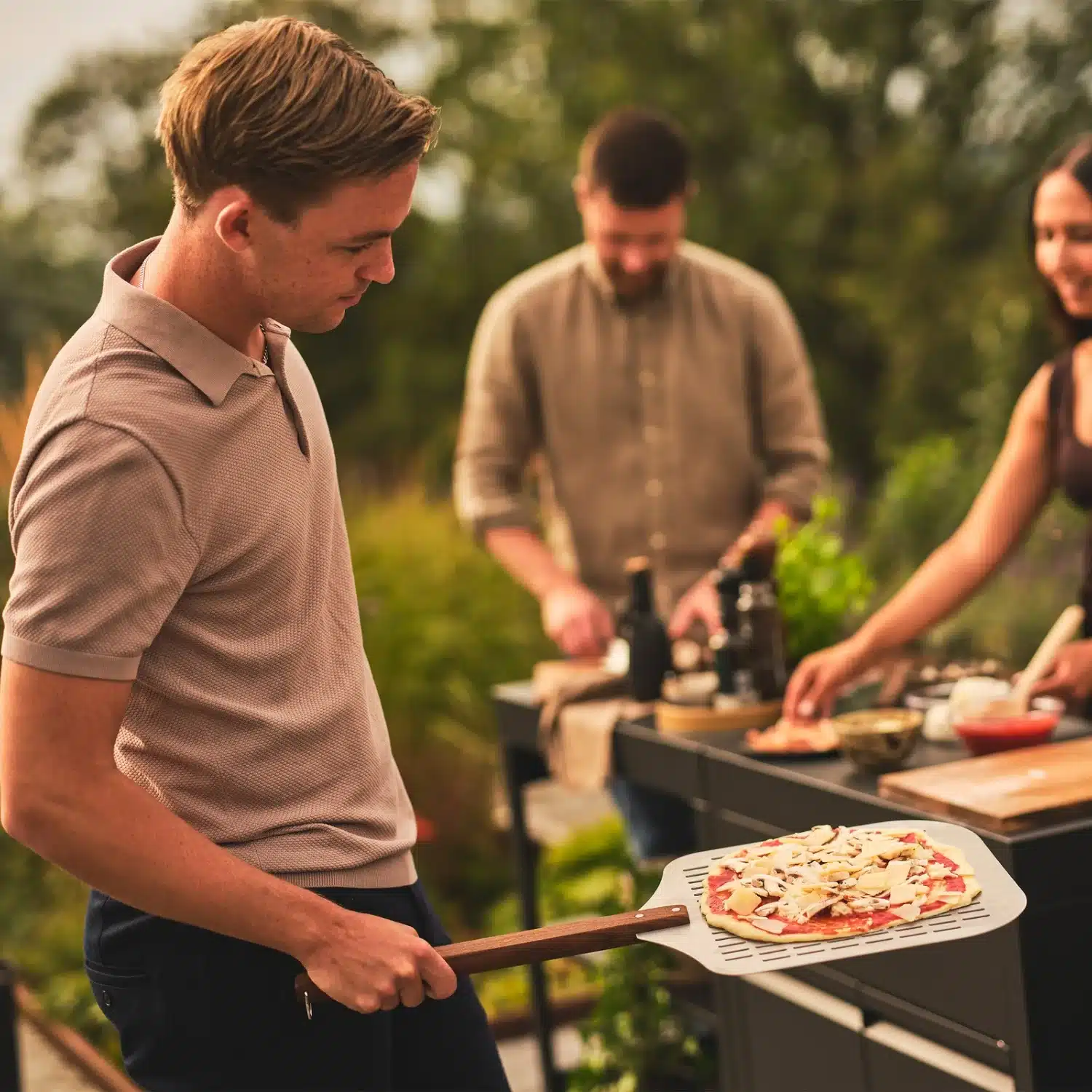 Perforerad pizzaspade av aluminium, med ergonomiskt D-format handtag i FSC-certifierat rökt ask.