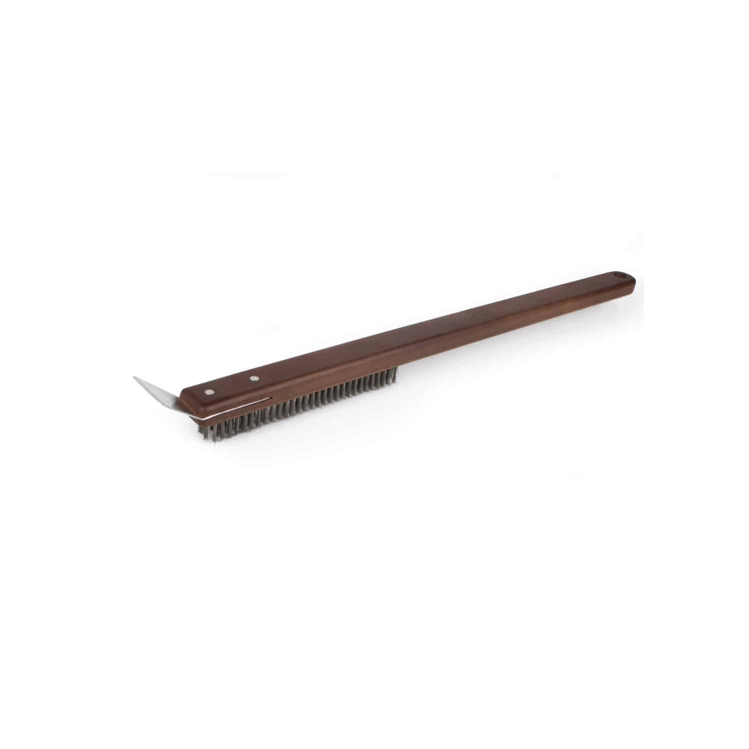 Borste med skrapa som gör det enkelt att rengöra din pizzaugn. Det långa skaftet gör att du smidigt når hela vägen in i ugnen och kan ta bort mjöl och fastbrända rester.