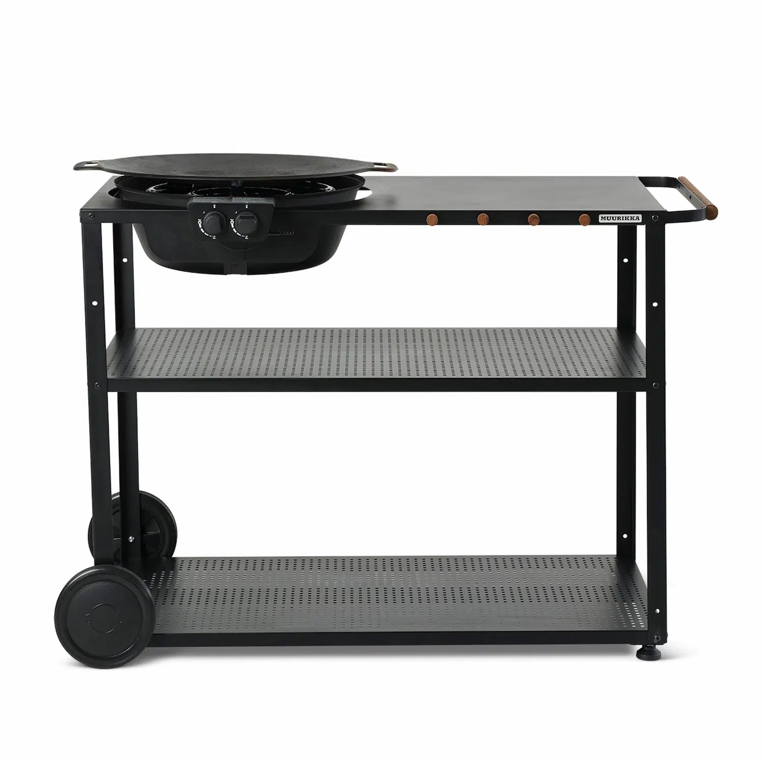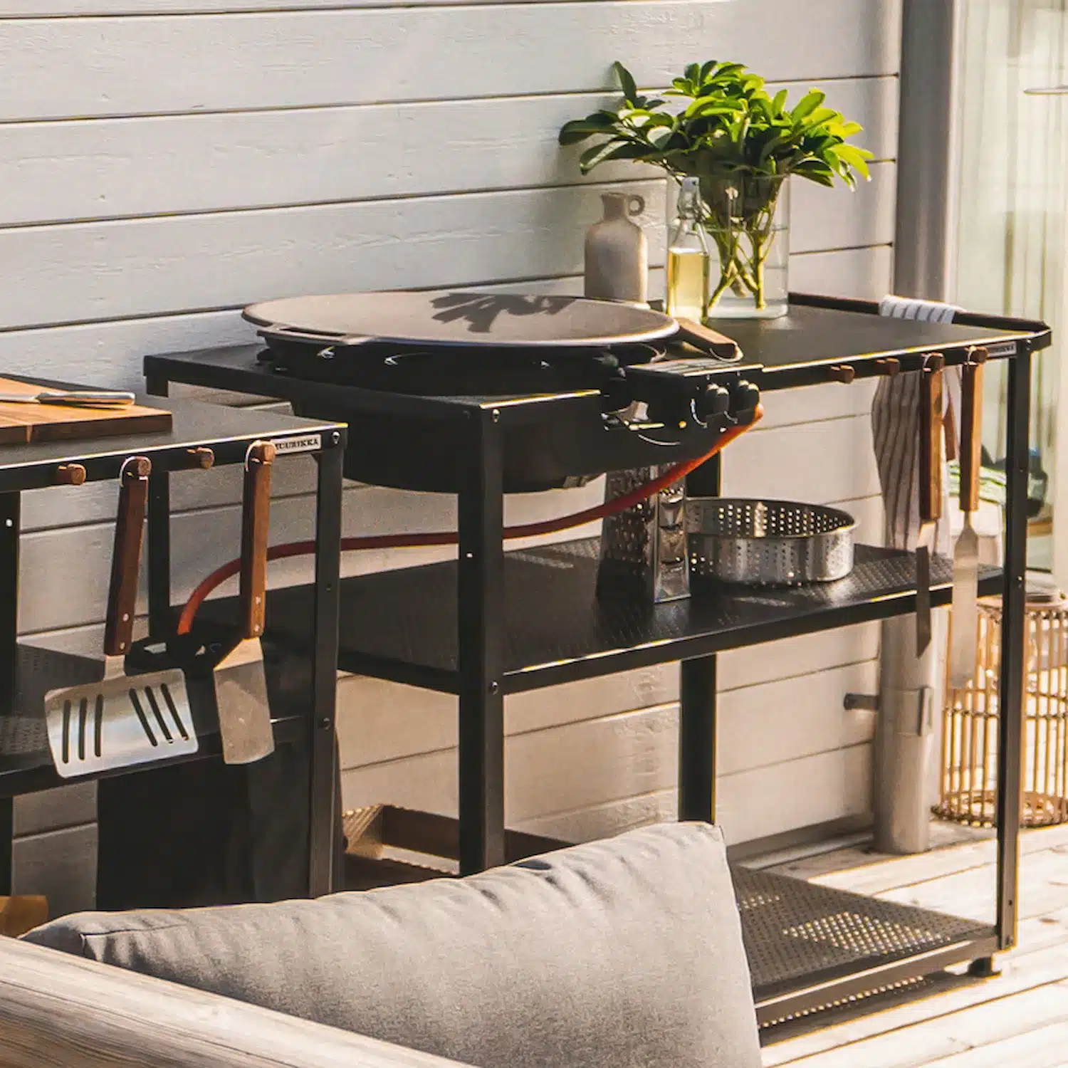 Muurikka Stekhällsset WG Svart 58 cm är en grillvagn av stål med integrerad gasolbrännare och stekhäll i varmvalsat stål, Ø58 cm. Gasolbrännaren har vred med integrerad tändning och tydlig markering för enkel användning. Värmen kan regleras individuellt på de två gasolringarna, vilket gör det möjligt att skapa olika temperaturzoner på hällen.