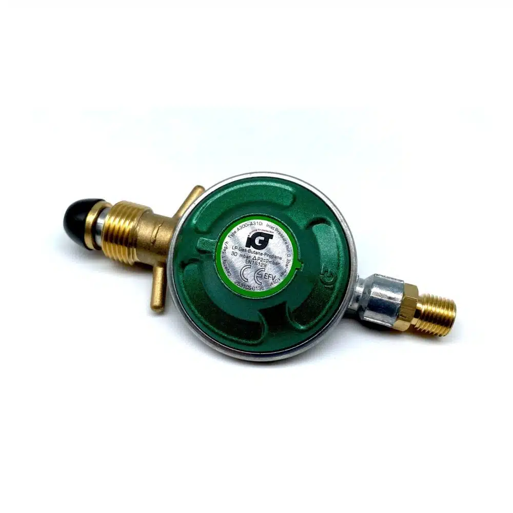 Reduceringsventil 30 mbar med vänstergänga för anslutning till gasolslang, nippel eller fjärravstängningsventil med motsvarande gänga.
