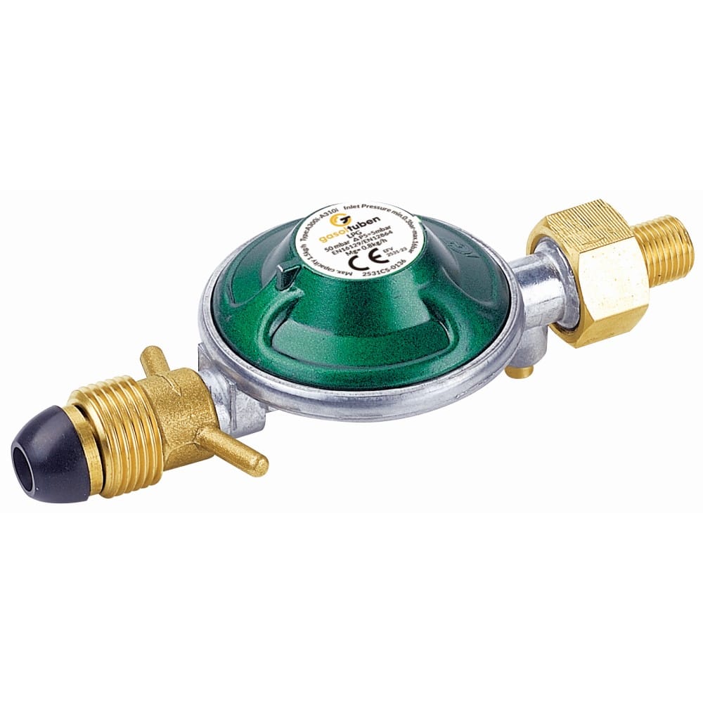 Reduceringsventil 50 mbar med 1/4″v slanganslutning. Går att få med slanganslutning till Ø  8mm gasolslang.