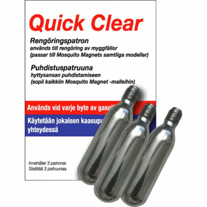 3-pack rengöringspatroner till Mosquito Magnet. Rengöringspatronerna avlägsnar föroreningar från gasolspridaren och säkerställer att myggfällan startar och fungerar optimalt.