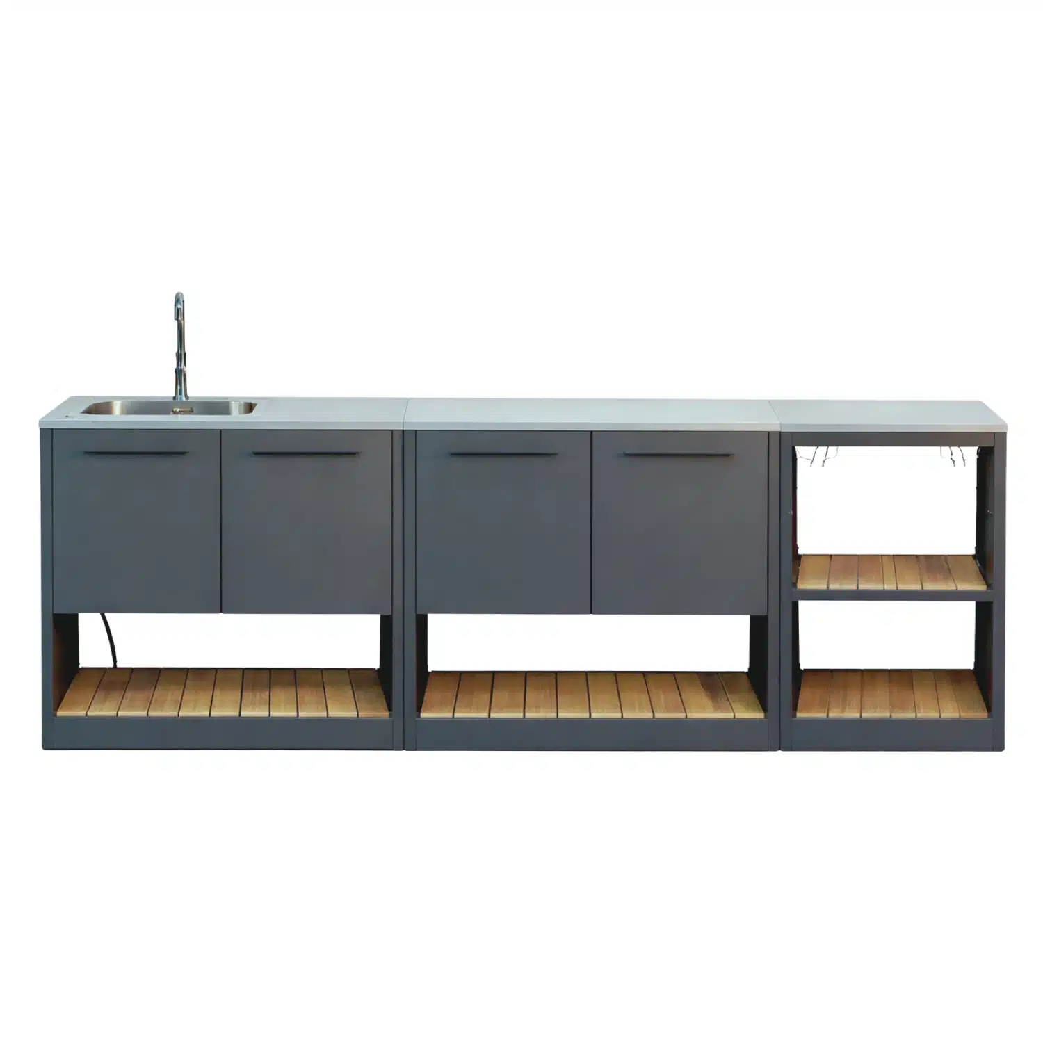 Tänk dig att kunna förbereda maten, diska och organisera middagen direkt vid grillen. Undvik att springa fram och tillbaka mellan köket och altanen! Saharas Uteköksö – Medium gör det enkelt och mer roligt att laga mat utomhus och ger dig samma funktioner, känsla och enkelhet som ditt inomhuskök. Saharas utekök är byggd för svenska väder med bänkskivor i rostfritt stål och UV-beständigt färg som håller år efter år.