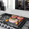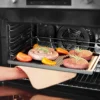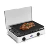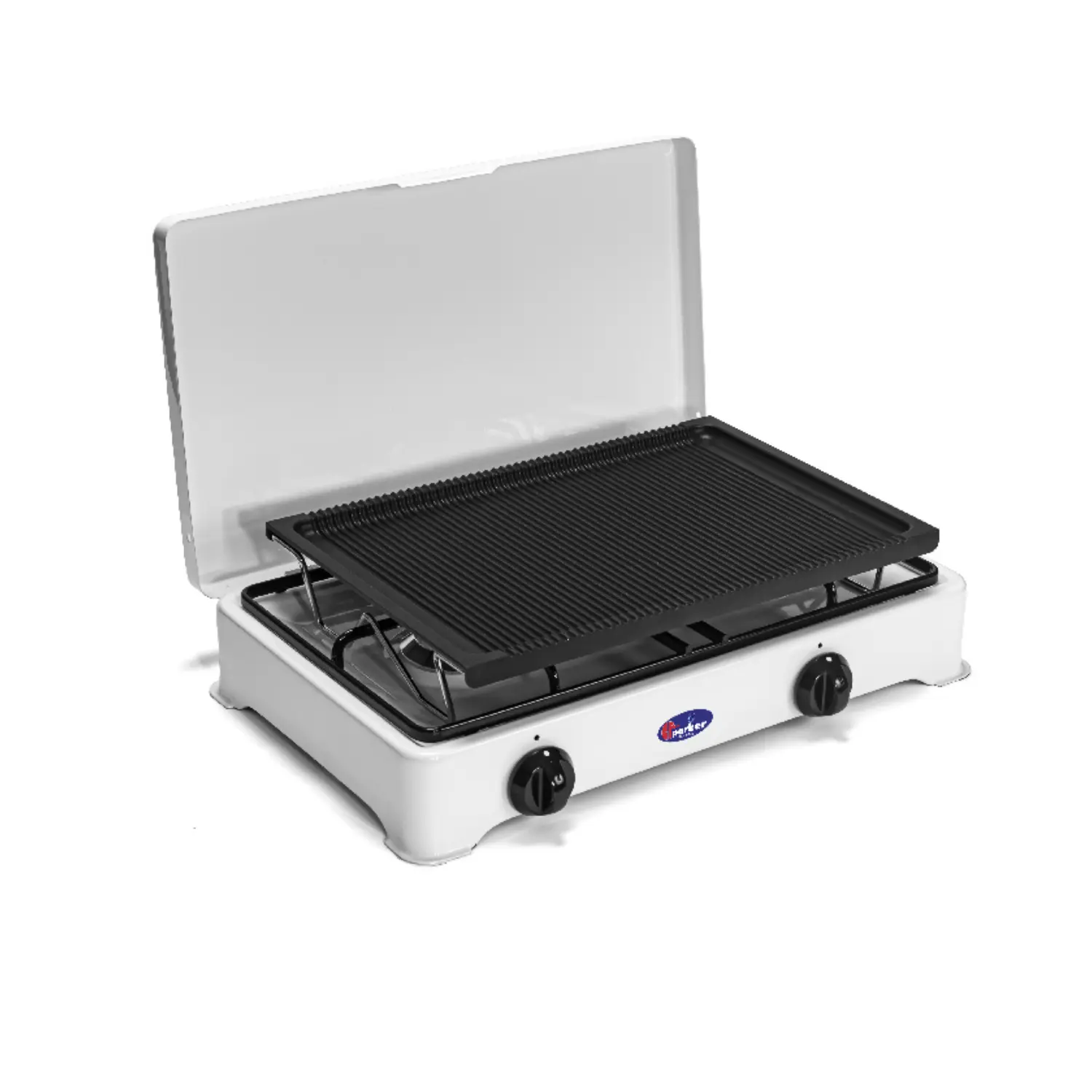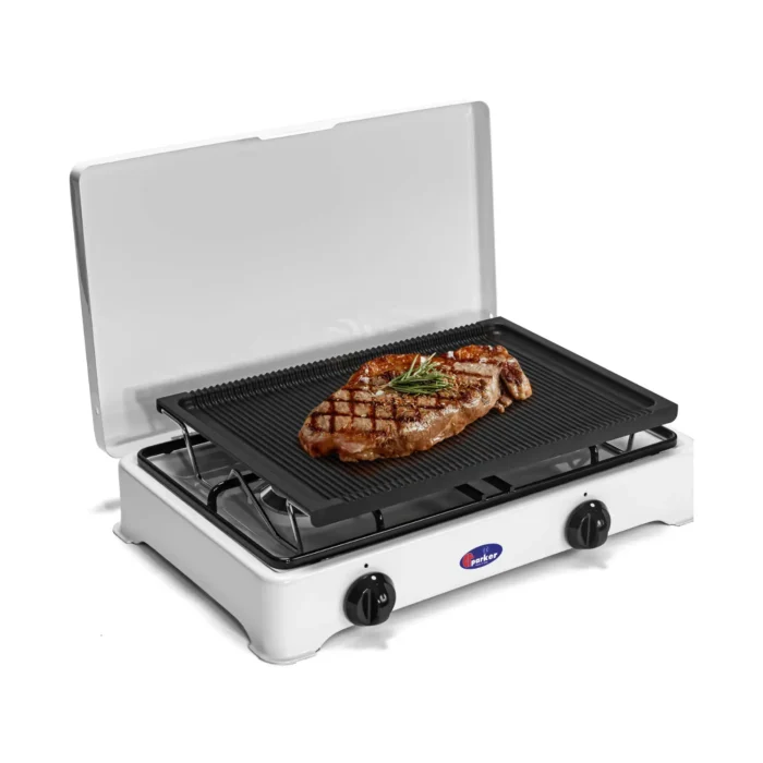 Grillplatta i aluminium från Parker med en teflonbelagd, ribbad yta. Grillplattan kan användas på Parker gasolkök med två brännare tillsammans med det medföljande stativet. Plattan kan även användas i ugnen utan stativ samt på gasspis. Ytan i teflon gör att maten inte fastnar på samma sätt som på ett vanligt grillgaller.