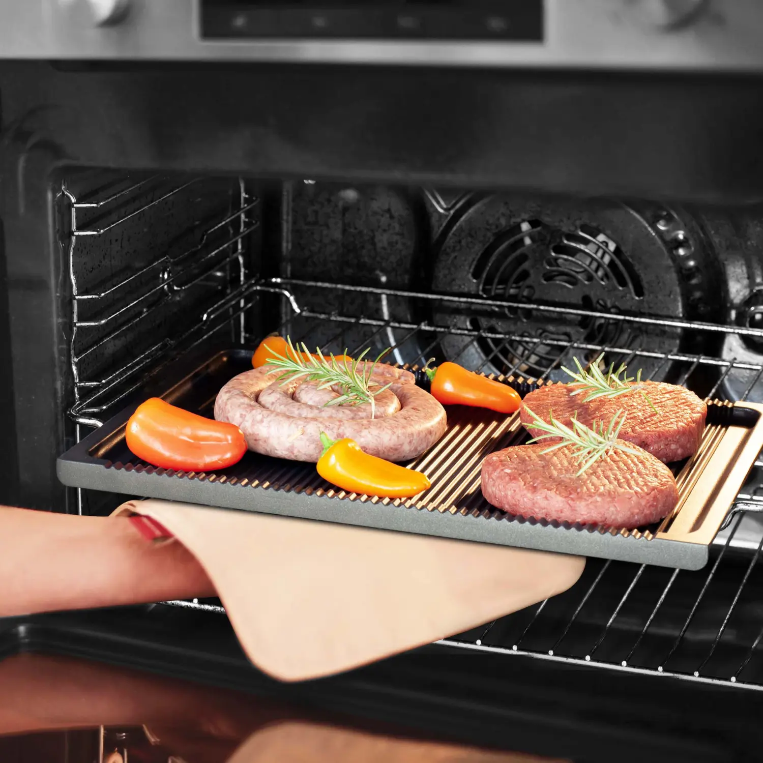 Grillplatta i aluminium från Parker med en teflonbelagd, ribbad yta. Kan användas på portabla gasolkök med 2 brännare, i ugn eller direkt på gasspis.